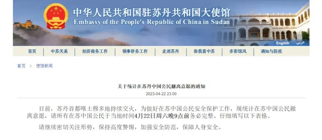 在22日時,中國駐蘇丹使館也發佈了通知,統計公民的撤離意願。可以説,中國從蘇丹撤僑是一個大概率事件。