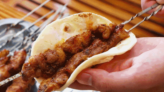 新疆民族特色的風味小吃數不盡數,但烤羊肉串是這吃喝江湖裏盟主般的存在,新疆人民用紅柳枝串的大串羊肉,仿若江湖失傳已久的兵器重出江湖般傲視羣雄,而西域特有的孜然粉天然有種勾引食慾的功能,抓一把灑在滋滋作響的大肉串上,再抓一把辣椒麪……紅柳枝的香氣伴隨着肉質鮮嫩的醇香,任誰都無法抵禦。