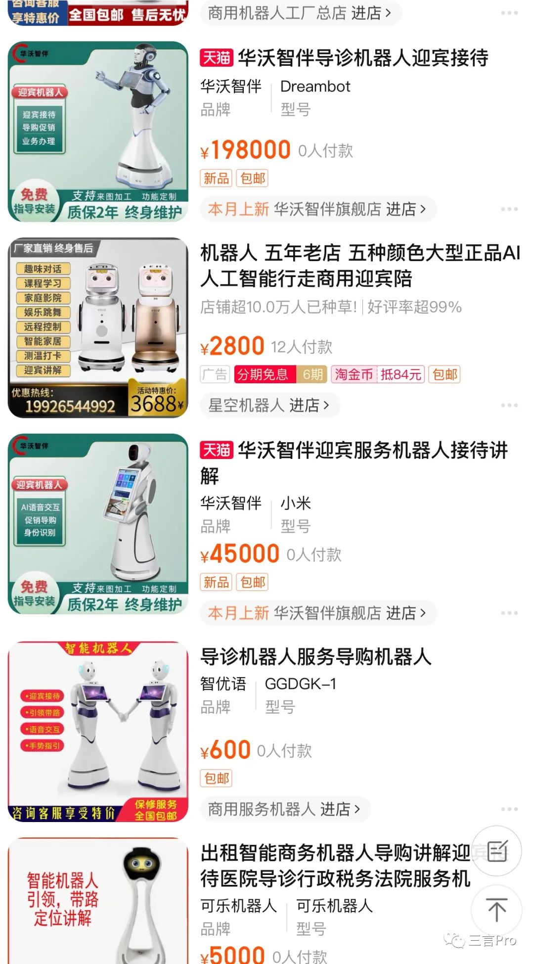 這種人工智能硬件產品,甚至已經普及到普通消費者都能在電商平台隨便搜索、下單購買的地步。筆者隨便在電商平台上就能搜到多種不同品牌的智能導診機器人。