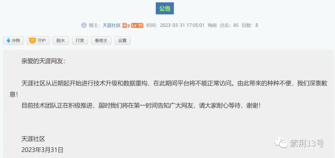 目前,坊間有幾種傳言,一是就像公告所言,天涯在做“技術升級”;