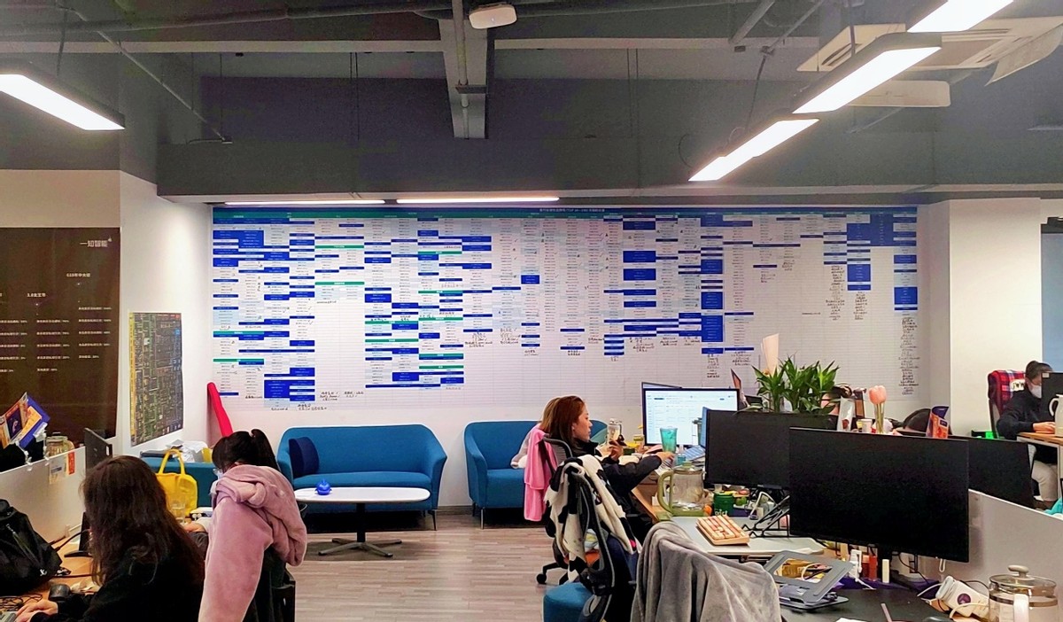進入一知智能的業務辦公室,最顯眼的是一幅全尺寸的客户牆,用明確的顏色劃分着不同推進階段的目標行業客户,同時用透明化的方式,把標準化的客户服務流程、算法模型迭代進度全部印刷出來貼到了牆上。
