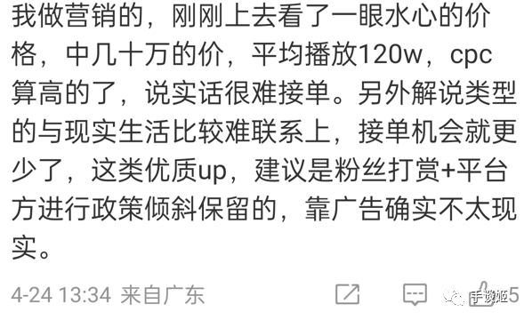 一方面,木魚水心雖然粉絲多,但是在影視解説這一分區中,粉絲的屬性會比較複雜,不像美妝區或者車區、數碼區、遊戲區這類UP主那樣垂直。在一單廣告要中幾十萬的情況下,廣告主可能會偏好羣體更精準的號投放。