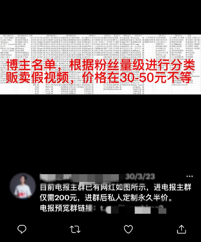 隨着我的深入瞭解,我發現“AI盜臉”背後好像已經形成了一條完整的產業鏈。產業鏈的這端是不法分子通過AI換臉技術賺錢。他們將明星、博主甚至素人的臉製作成假的色情照片與視頻,明碼標價地獲取利益。我曾看到過一個網紅名單,表裏密密麻麻寫滿了我熟悉的名字。他們根據博主的粉絲量級進行分類,假視頻價格在30-50元不等。但只要你花200元就可以進羣,進羣后不僅可以享受永久半價,甚至還能接“私人定製”。