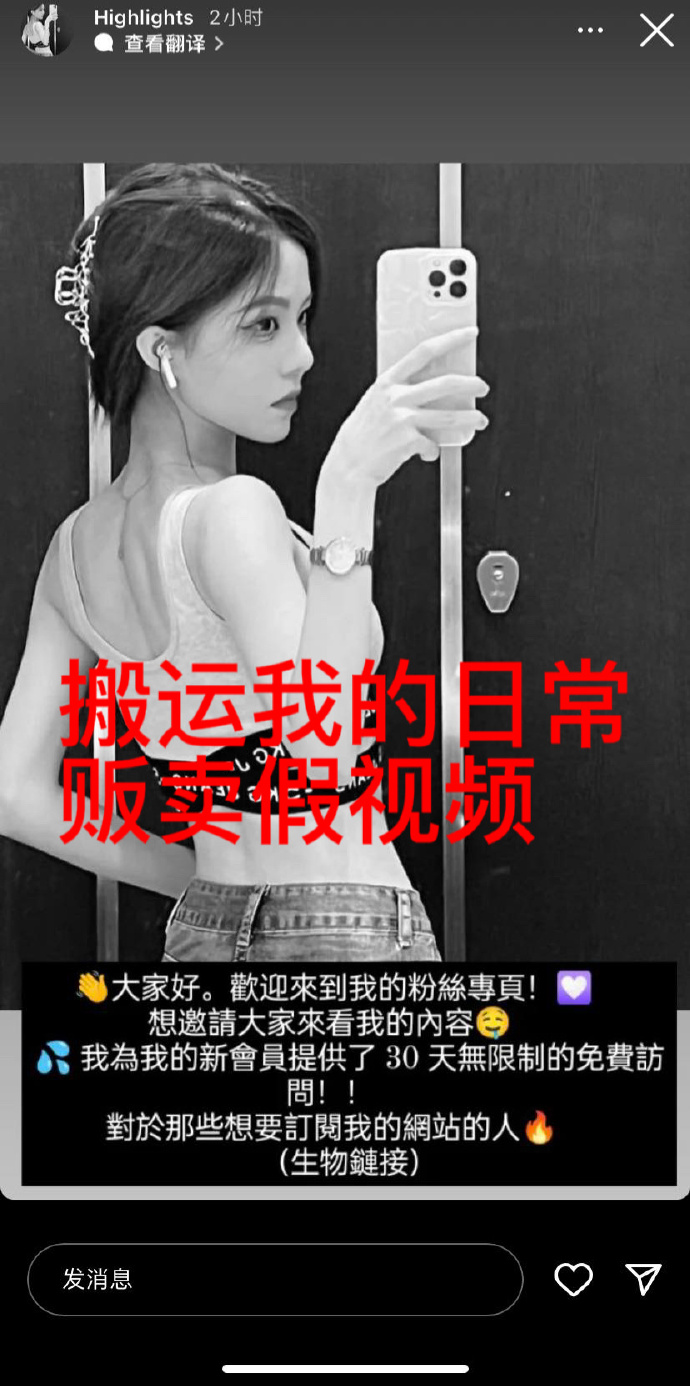 首先,我發現在境外社交平台上有人冒充我註冊了假賬號。他們先是頂着“賴賴”的名義搬運我的日常內容,等到粉絲人數差不多的時候就以會員訂閲的方式販賣視頻。為了吸引更多人的加入,新會員首月還是免費的。此後只需要花費21.6美元,就可以在未來的半年裏源源不斷地收到那些所謂的only