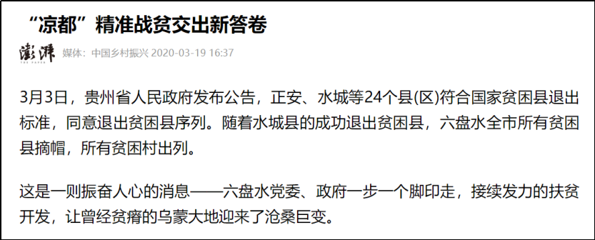 2020年3月,隨着六盤水市水城縣成功退出貧困縣,六盤水全市所有貧困縣摘帽,所有貧困村出列。