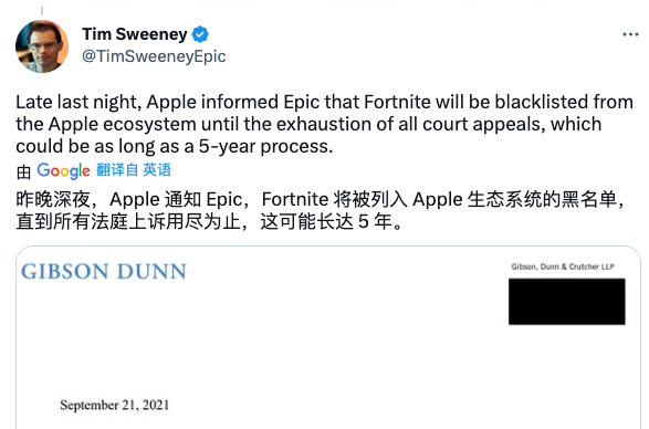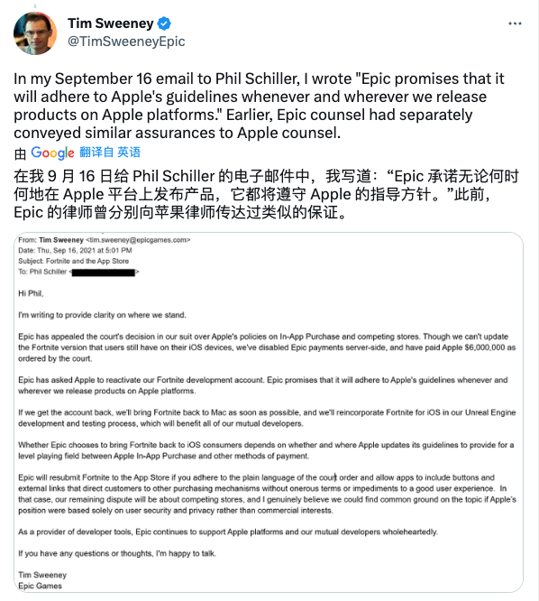 而 Epic 方面也不覺得自己輸了,Epic 首席執行官蒂姆·斯威尼 ( Tim Sweeney )在社交平台發文説到:“ 雖然蘋果勝訴 ”,但法院還是做了個正確的判罰的。