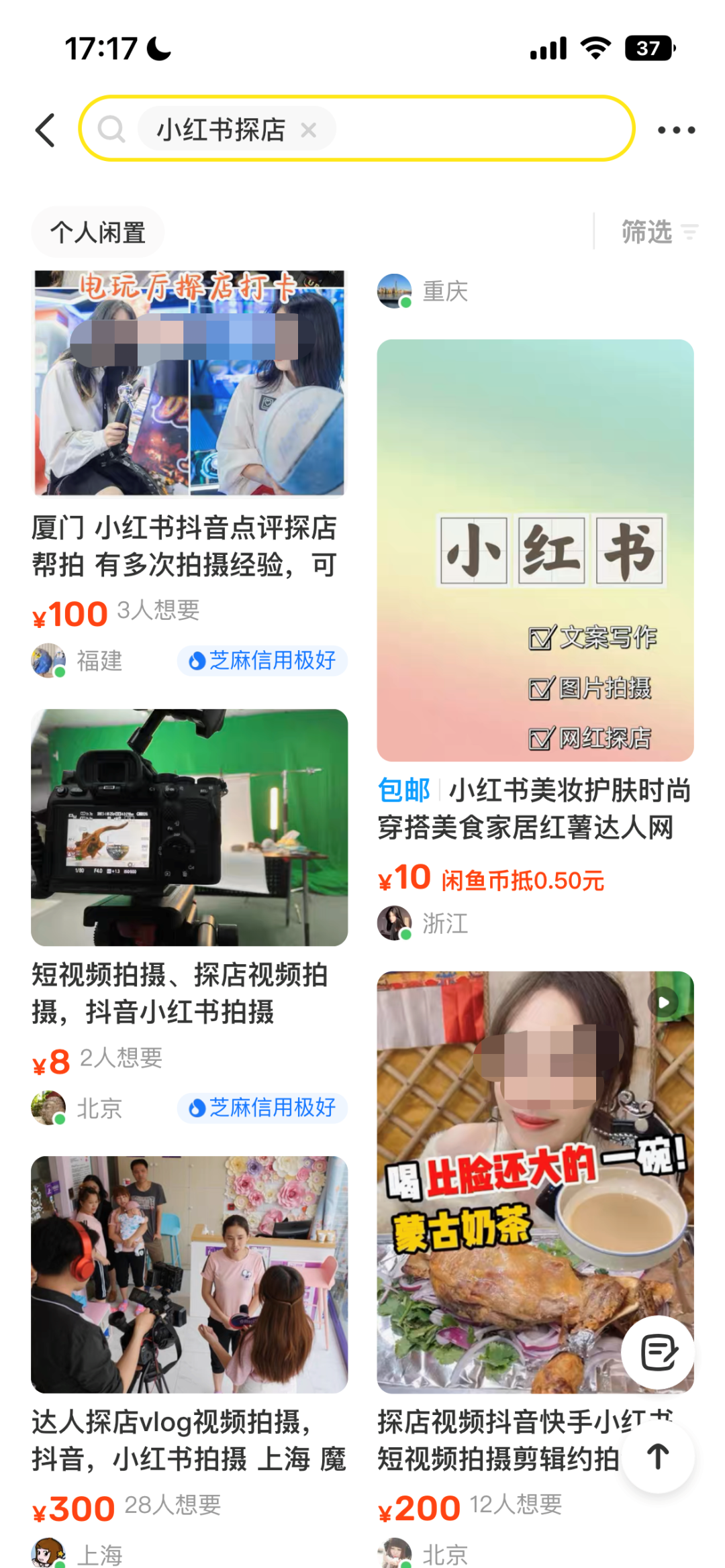 如果你在閒魚上搜索“小紅書/抖音探店”,就能發現各種明碼標價的探店推廣。
