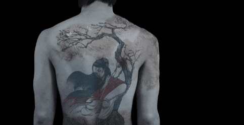 他的背上,還文着一幅與現代社會格格不入的仕女圖。