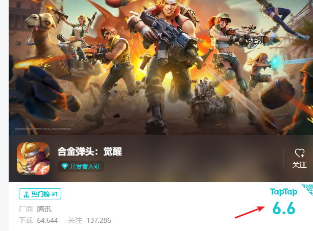 在 TapTap 上《合金彈頭:覺醒 》雖然也是熱門榜第一的遊戲,這款它的評分也僅僅只有 6.6 分。