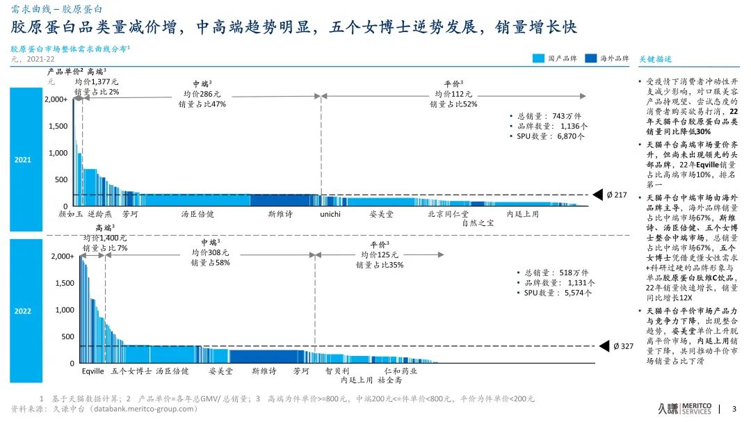 天貓中端市場頭部效應顯著,斯維詩、湯臣倍健、五個女博士整合中端市場,總銷量佔比中端市場67%,五個女博士憑藉更懂女性需求+科研過硬的品牌形象與單品膠原蛋白肽維C飲品,22年銷量快速增長,銷量同比增長12X