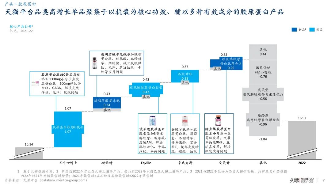 保健品具有情感屬性強、對賣點傳遞要求高的特點,適合通過短視頻、直播的形式售賣,因而膠原蛋白類保健品在抖音平台銷售好,2022年抖音平台膠原蛋白保健品體量已超過天貓,受抖音平台持續分流影響,22年天貓平台膠原蛋白品類銷量同比降低30%,消費者對口服膠原蛋白的成分、功效愈發看重,高效、創新、高品質的產品趨勢推動行業均價提升,品類單價大幅度提升導致膠原蛋白品類銷售額在銷量走低之下仍保持正增長,22年天貓平台膠原蛋白品類銷售額同比21年增長5%
