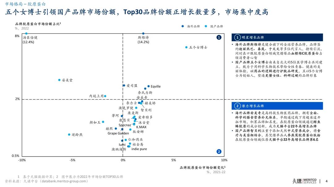 國產品牌五個女博士涉足口服美容與護膚行業,打造更懂女性+科研過硬的品牌形象,獲得消費者關注,22年品牌在天貓膠原蛋白品類份額排名第三,在高增長品牌中排名第一