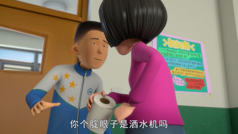 “你腦袋讓門框擠了”,在該動畫片第一季第一集中,作為主角之一的老師石妙娜,就在課堂上對正在翻着書包“差生”馬澤平展開了“無情批評”。而在接下來的劇集中,這位“暴躁易怒”的班主任,對學生的言語攻擊“變本加厲”,“我要是你就去一頭撞死”“你個屬大米包(倒數第一)”等言語張口就來。