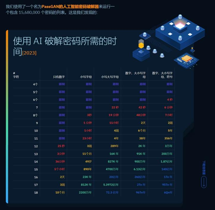 上述匿名黑客進一步表示,普通的密碼破解工具,是按照一定的順序去碰撞(嘗試),通俗易懂地説就是暴力破解,引入AI能力之後,分析已知的泄露密碼庫,歸納密碼出現的頻率,並率先使用高頻密碼進行碰撞,碰撞不成功再啓用窮舉法暴力破解,這考驗的是密碼的複雜程度,以字母大小寫疊加數字的12位非常規密碼為例,PassGAN破解需要2000年。