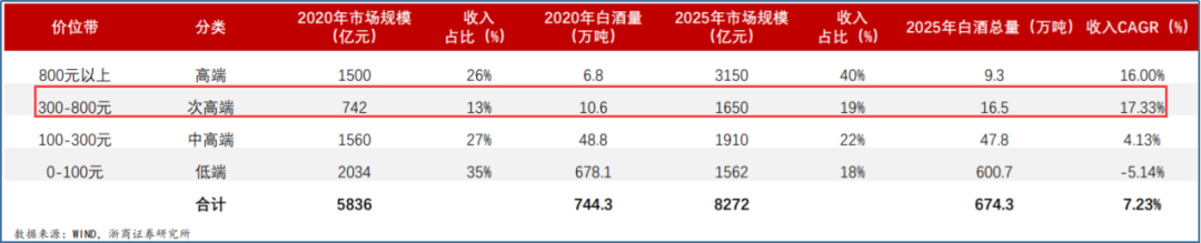 浙商證券研究報告顯示,2020年國內次高端白酒市場規模為742億,在國內白酒市場佔比13%,預計到2025年市場規模將達1650億,佔比提升至19%,複合增速為17.33%,高於同期高端白酒市場複合增速的16%。