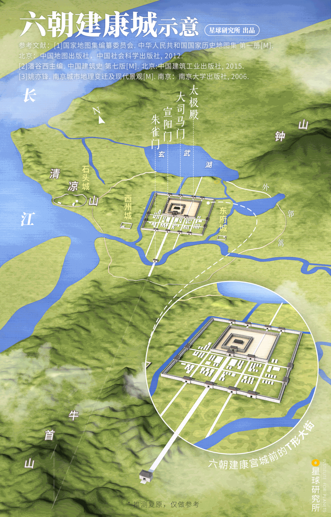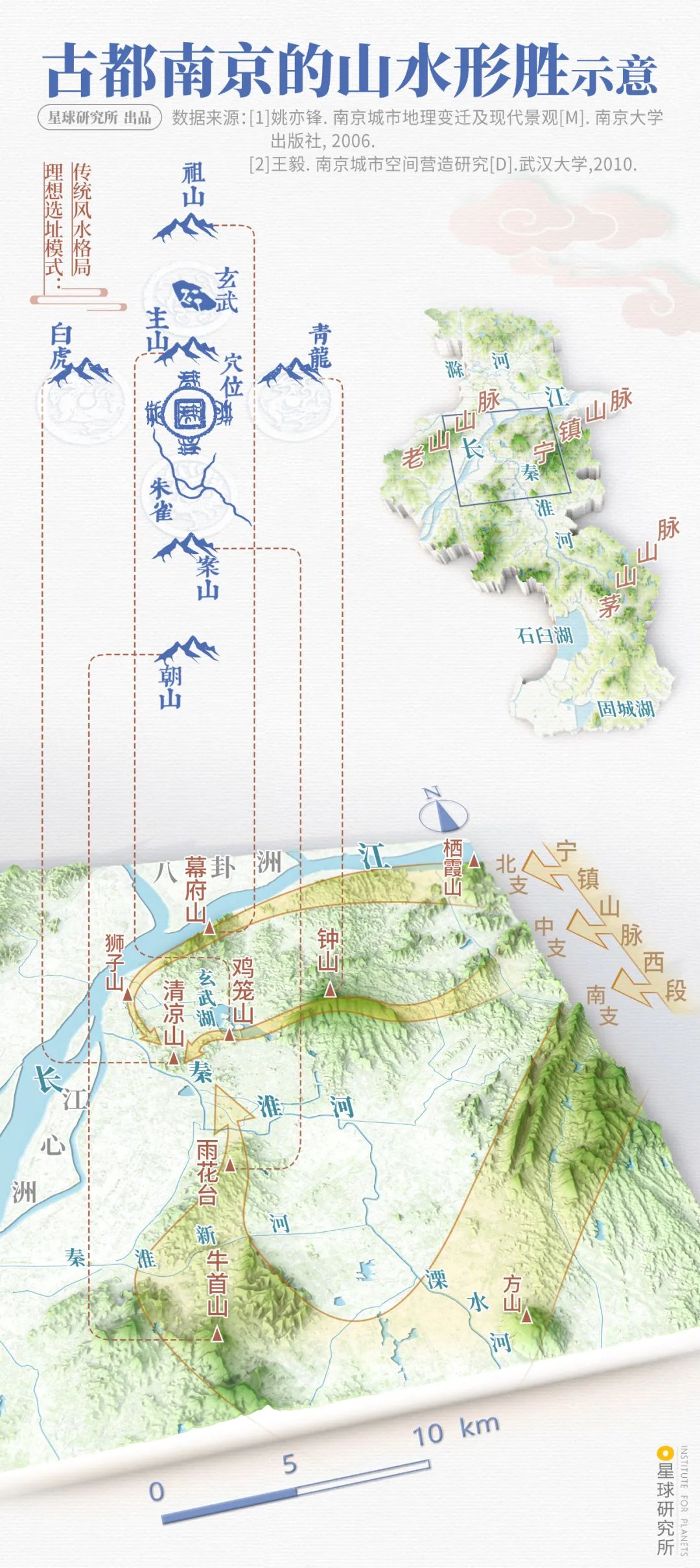 (上文引自北宋《太平御覽》;下圖為古都南京的山水形勝示意,製圖@陳志浩/星球研究所)