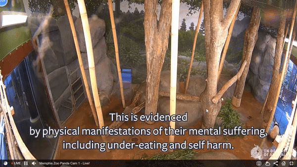 通過美國動物保護組織發佈的影片,可以看到丫丫在本就不寬敞的室內場館搖頭晃腦、不斷地在同一處繞圈爬行。