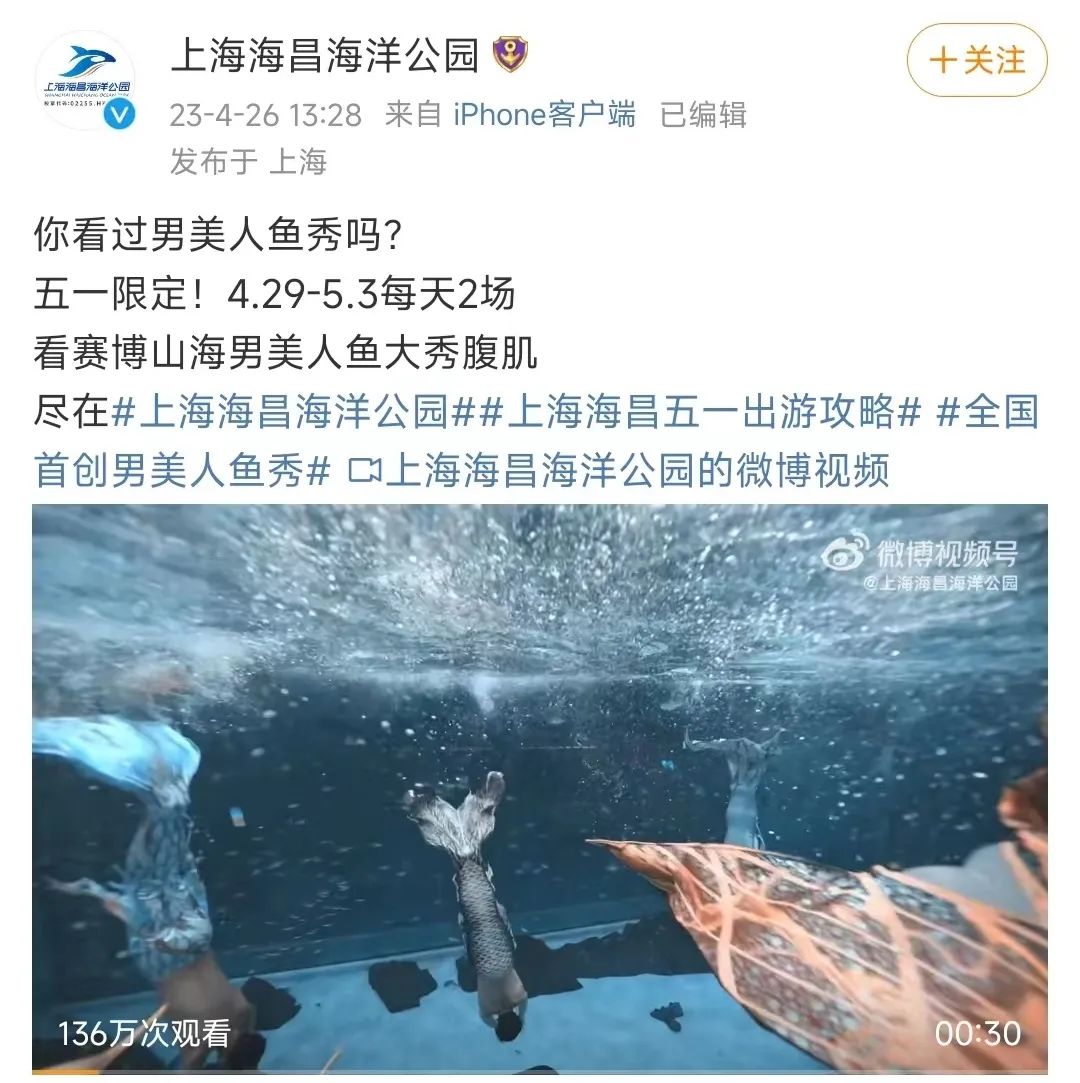 上海海昌海洋公園五一推出全國首創男人魚秀!下次還是讓人魚姐姐來表演吧!_風聞