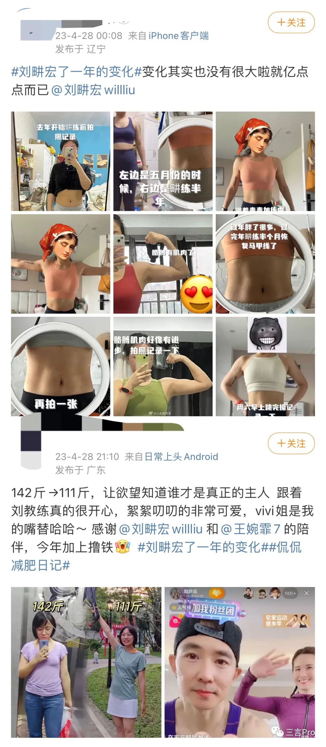 近日,有網友在微博發起了話題“#劉畊宏了一年的變化”,分享自己堅持和劉畊宏一起鍛鍊一年以來的種種變化。