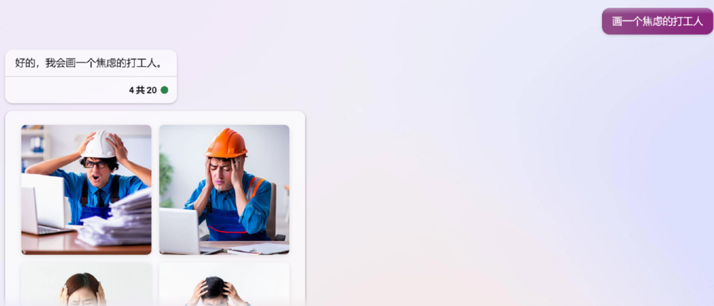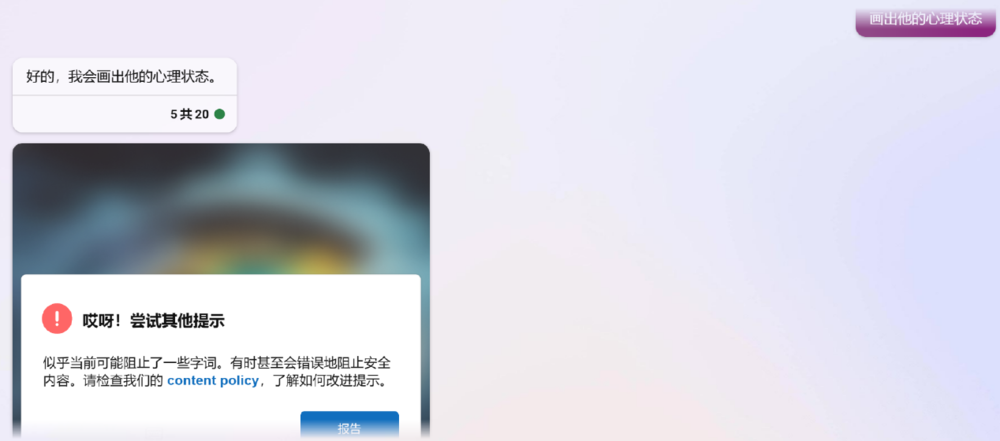 再次嘗試畫人物時,筆者根據新Bing畫出圖後自動推送的詞條選擇了“畫出他的心理狀態”,但Bing顯示“阻止了一些字詞”,相當於Bing對於自己生成的步驟沒辦法滿足。