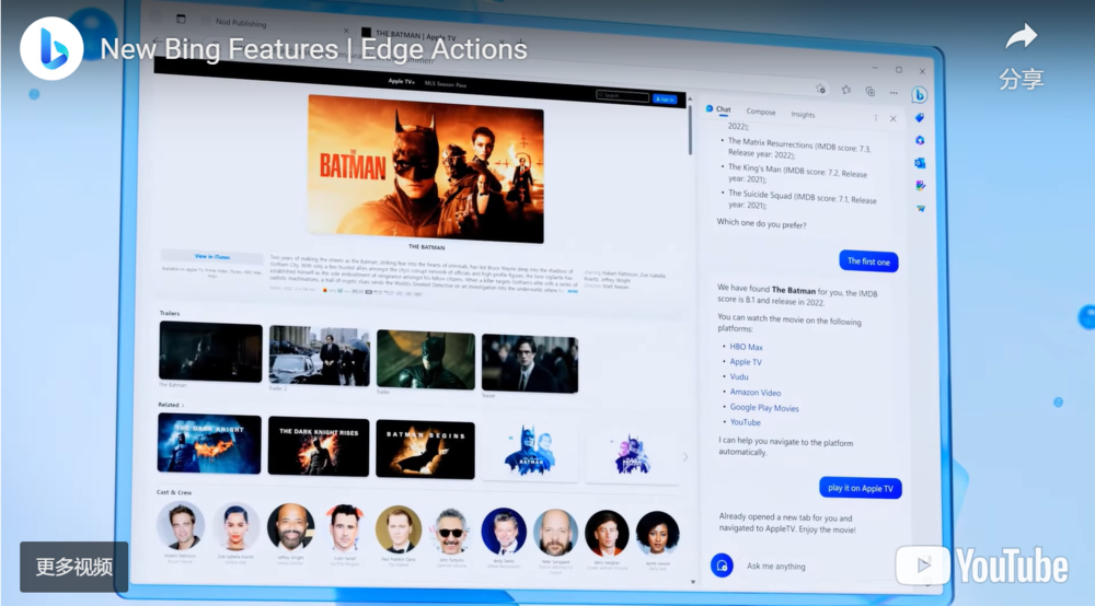 例如你想看某部電影,Edge中的操作會在邊欄的聊天中找到並顯示選項,然後從可用的地方播放你想要的電影。Edge Mobile也會包含頁面上下文,你可以在Bing聊天中提出與正在查看的網頁相關的問題。側邊欄中的撰寫功能現在還可以根據用户提供的反饋(例如語氣、長度、措辭等)來寫草稿。