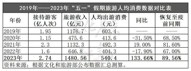 據文化和旅遊部數據,2023年“五一”假期全國國內旅遊出遊合計2.74億人次,按可比口徑恢復至2019年同期的119.09%;實現國內旅遊收入1480.56億元,按可比口徑恢復至2019年同期的100.66%。人均消費540.35元,較2019年同期下降15.5%。