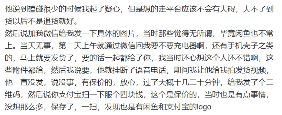 “ 熱心 ” 老哥這時候突然打了個電話過來,説手機快遞需要買家用支付寶來掃一個保價的碼。