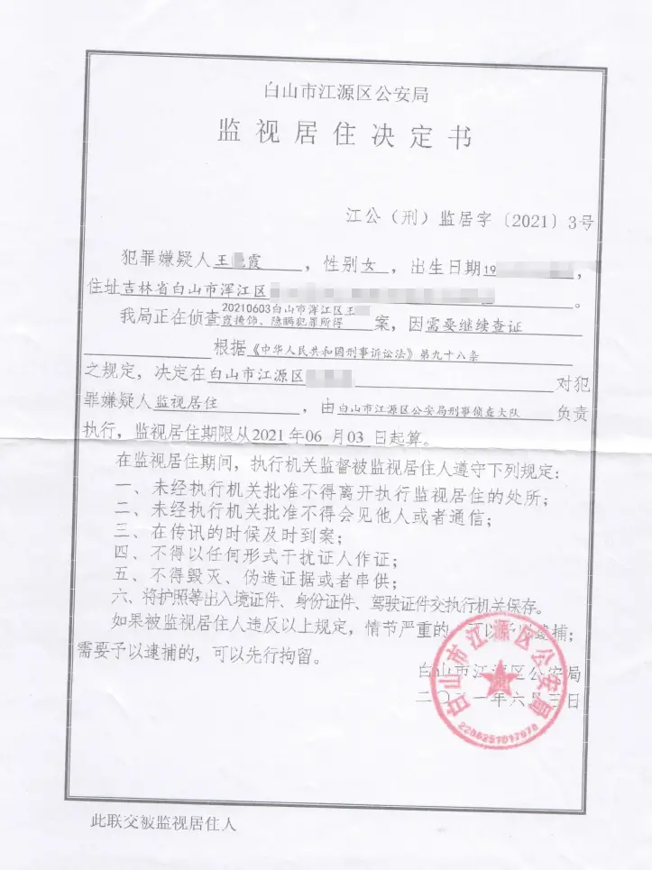 澎湃新聞此前報道,王某霞於2021年6月3日因涉嫌掩飾、隱瞞犯罪所得罪被白山市江源區公安局帶走調查。同日,因需要繼續查證,江源區公安局作出《監視居住決定書》,決定在白山市江源區育林街對王某霞監視居住,由江源區公安局刑事偵查大隊負責執行,監視居住期限從當日起算。