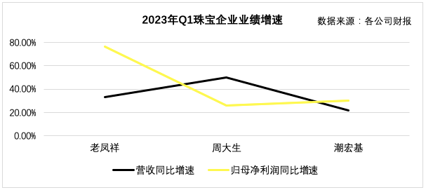 相較之下,下游玩家的滋潤不少,身軀日漸肥碩。2023年Q1,老鳳祥、周大生、潮宏基,三家公司營收、利潤均實現雙位數增長,尤其是老鳳祥,利潤增速接近營收增速兩倍。