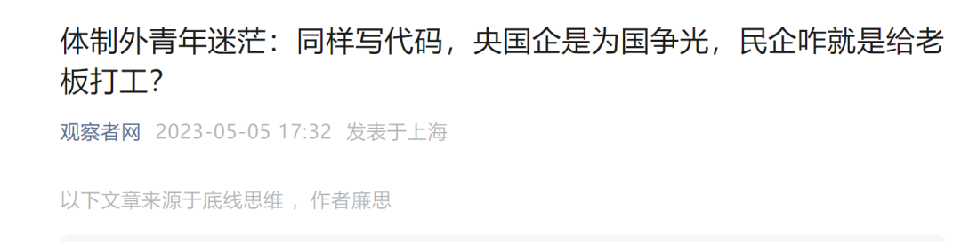 所以,才會有這個相當普遍的困惑:為什麼同樣是程序員,在互聯網公司寫代碼,就是“為資本家打工”,而在央國企或者體制內寫代碼(很有可能只是維護系統或者修電腦),就是“為國爭光”,因為他就是“國家的人”。