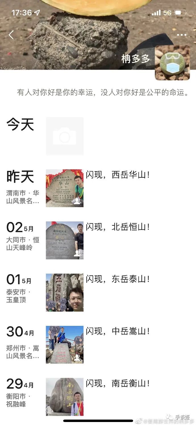 但若是五天連爬五座山,對於一般人的體力來説,恐怕也是難以消受的。網絡上還有3天連爬五嶽的,只不過爬山中途使用了纜車道具,給觀眾的感覺就沒有這位柟多多走步俠給人的印象深刻。