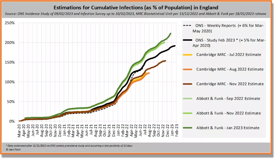 根據目前大英帝國統計局ONS的統計,《Cumulative COVID-19 infections time series, England - Office for National Statistics --- 累計 COVID-19 感染時間序列,英格蘭 - 國家統計局[9]》,推特上的Jean Fisch老師做了圖: