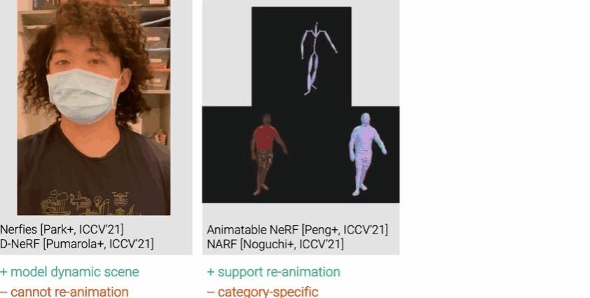 還有東京大學提出的動畫方向的 NeRF,這個項目就不單單是生成一個靜態的場景了,它甚至可以把運動的角色和物體都給你生成出來。