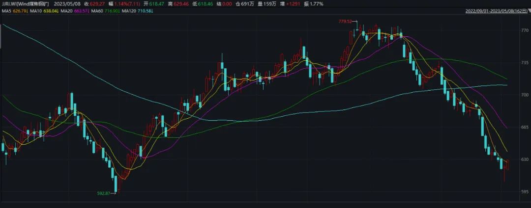 焦煤(1413,89.50,6.76%)方面,劉燕君認為,煤礦出貨依舊困難,汾渭監測本週樣本煤礦原煤庫存周環比增加24.85萬噸至436.87萬噸,在產地連續七週增庫的情況下,目前產地庫存已逐步趨近2020年以來最高水平。價格方面,由於期貨盤面及成材價格再度大跌,“雙焦”後市仍不樂觀。5月7日,焦炭開啓第六輪提降,焦煤降價壓力持續,5月5日運城河津地區部分瘦煤價格下調70—100元/噸,預計市場煤價仍有一定下行空間。進口海運煤方面,澳煤價格大幅下滑後,海外市場需求稍有恢復,5月7日澳洲優質低揮發主焦最新成交價回升至236—235美元/噸,不過跟當前國內煤價相比,澳煤缺乏價格優勢,國內暫無接貨意願。