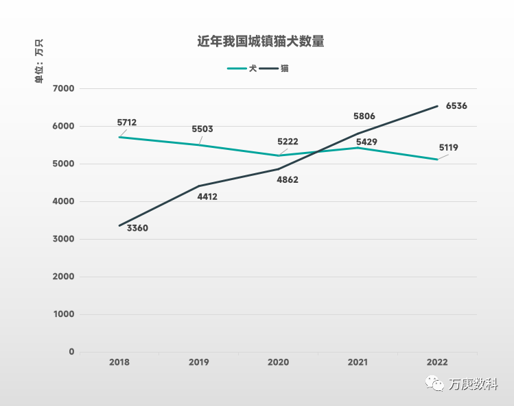 由於生活節奏加快,現代人羣壓力增大,主打“解壓、治癒”的寵物貓逐漸成為寵物市場中的新生驕子。2018年以來,我國城鎮貓犬數量呈相反的走勢,貓類數量一路上漲,從2018年的3360萬隻增長至2022年的6536萬隻,增長率近95%;犬類數量則整體下降,從5712萬隻縮減至5119萬隻;二者數量差(貓-犬)也從2018年的-2352萬隻逆轉至2022年的1417萬隻,充分表明了當前國內寵物市場中貓類更受消費者青睞,並能創造更為廣闊的市場價值。