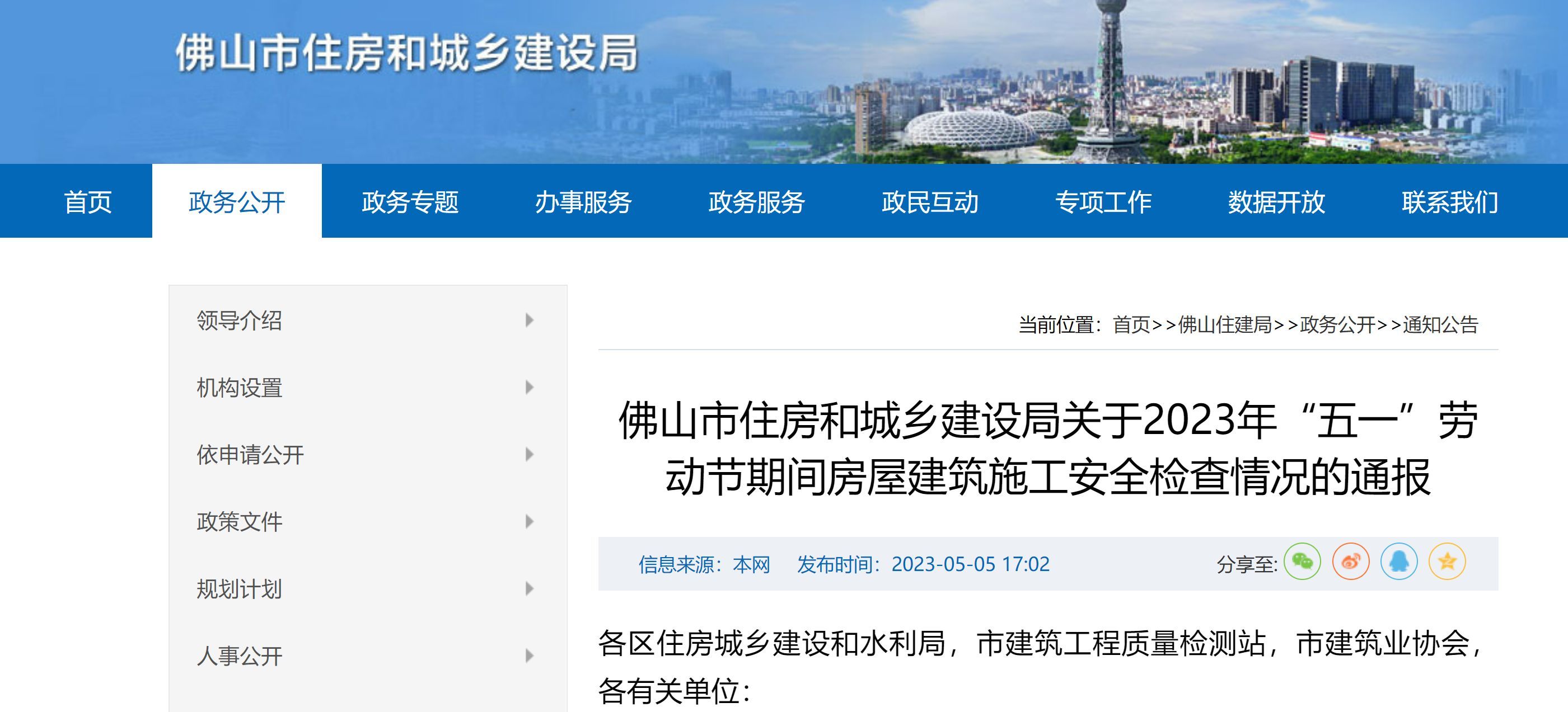 佛山住建局關於2023年五一期間房屋建築施工安全檢查情況的通報_風聞