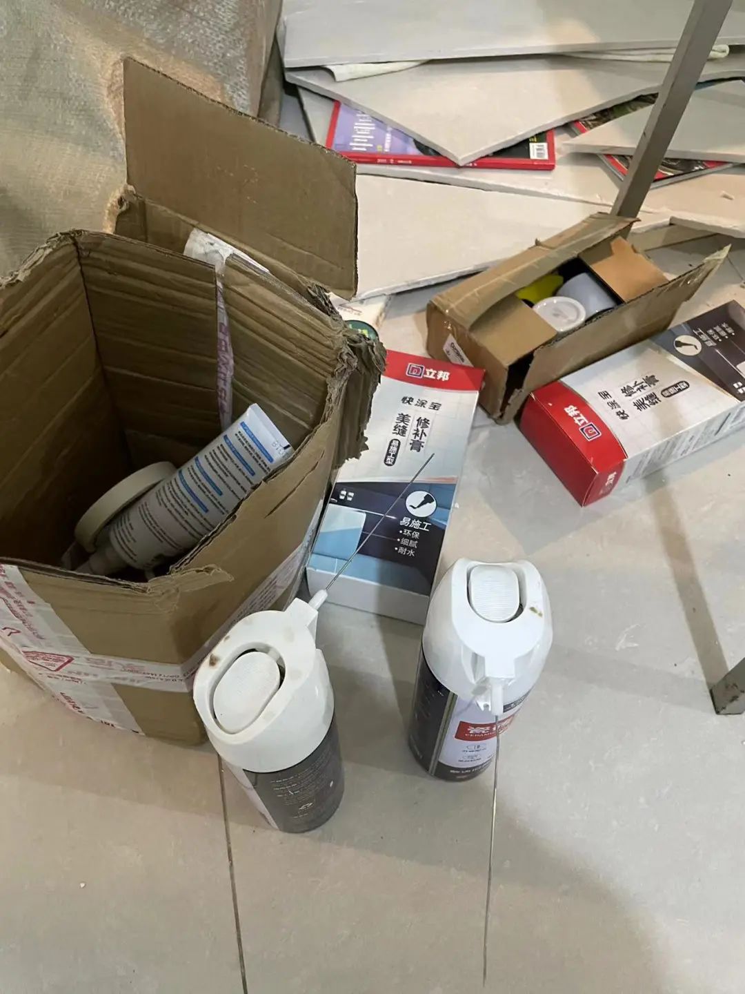 瓷磚膠、強力粘合劑、油灰刀、美縫劑、棉紗工地手套、瓷磚修補劑和釉面修復膏。