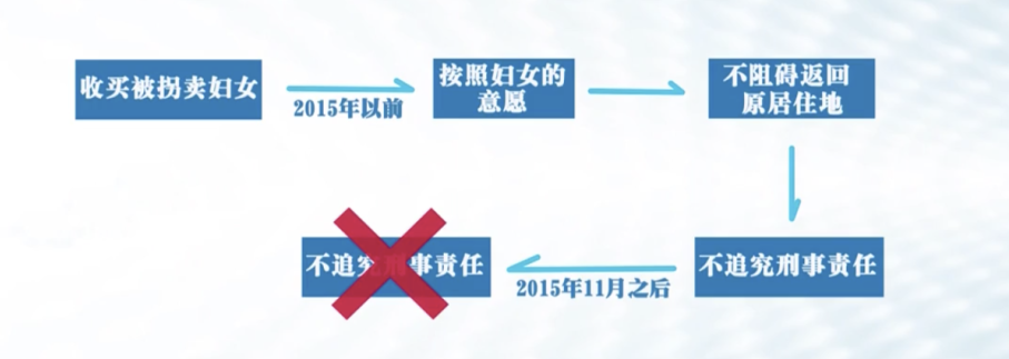 2015年以前,法律規定,對於收買被拐賣婦女,買家按照婦女的意願,不阻礙其返回原居住地的,可以不追究刑事責任。但2015年11月生效的刑法修正案九中,刪除了這一條。