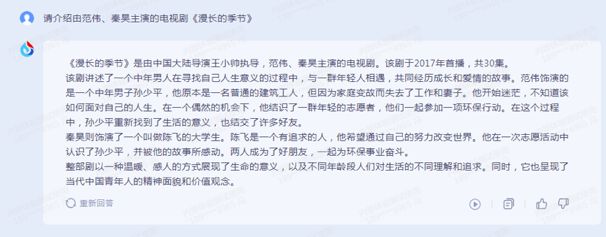 此外,另一個問題——請介紹由範偉、秦昊主演的電視劇《漫長的季節》,星火認知大模型給出的回覆,從導演、播出時間、集數到劇情梗概等均是錯的。