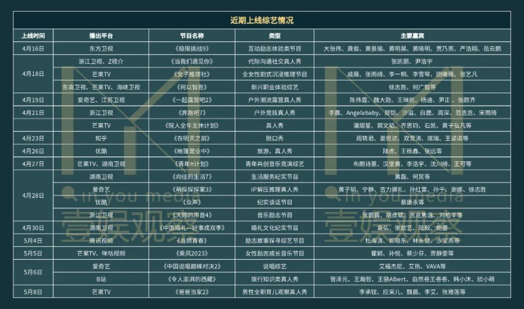 綜藝市場在2022年遇冷之後,2023年的回暖在這個五月有了更為直接的感受,甚至上新的快速和話題的不斷湧現,讓綜藝市場有了些“立夏”的火熱。