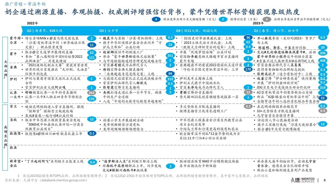 國產品牌市場份額佔優,蒙牛、伊利集團頭部地位穩固(23Q1市場份額佔比33.2%、21.2%,同比分別上升2.5個、5.4個百分點),通過多元化品牌策略、完善的渠道網絡、產品迭代與升級以覆蓋不同消費水平與不同階段的細分人羣,從而保持競爭優勢,伊利旗下高端品牌金典全平台穩定增長,蒙牛旗下高端品牌特侖蘇銷售額同比小幅下跌,但蒙牛併購有機奶品牌聖牧獲得亮眼增長,躋身常温牛奶市場TOP9