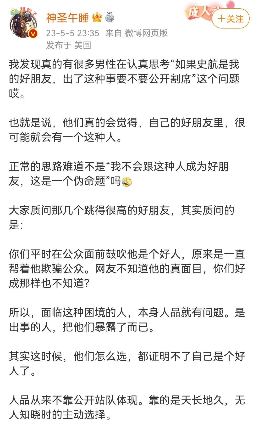 此後割席輿論擴大化,神聖午睡老師認為,“史航的好朋友跟史航都是一路貨”(大概意思),並認為“他們怎樣選,都證明不了自己是好人了”。