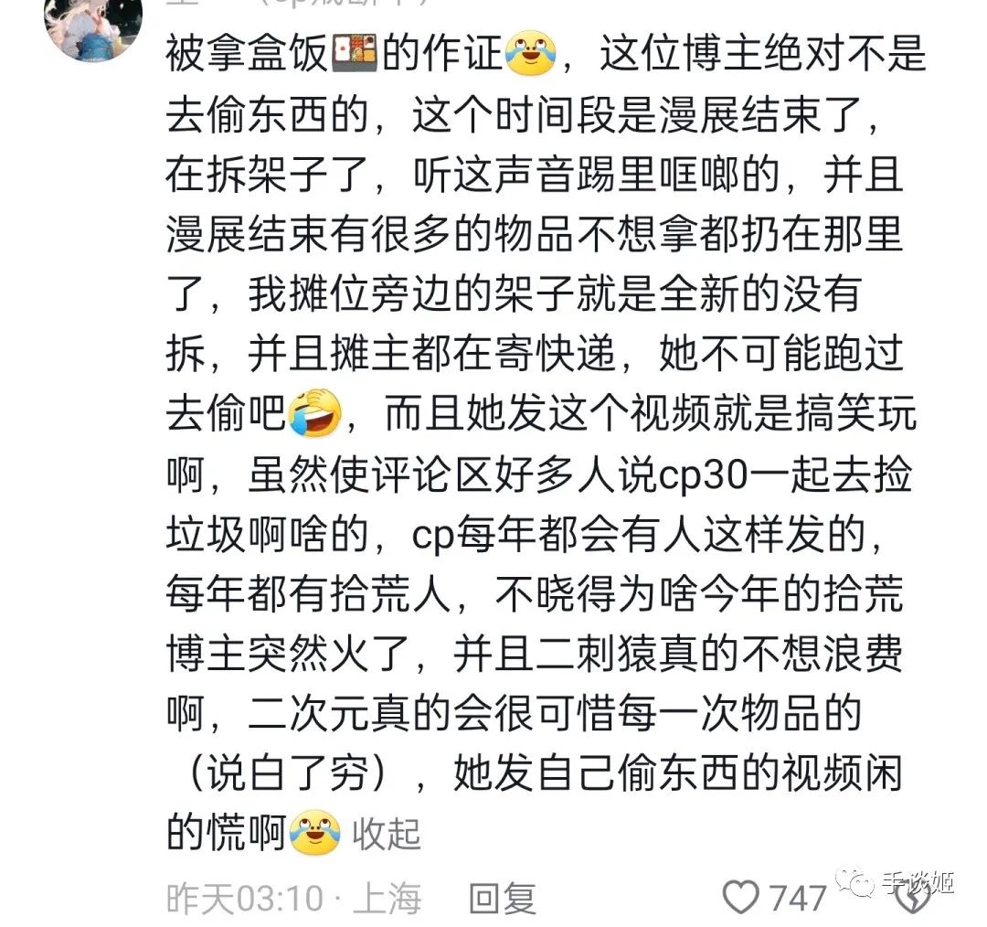不過為什麼會有那麼多有用之物被丟棄呢?根據參與了CP29或者其他漫展的網友的説法,是因為很多人來自異地,如果要將這些大型物品託運回家,可能運費就比架子本身要貴了(尤其是場內發快遞比外面貴3倍),而一些零散的小東西,紙巾啊,零食啊,則可能是因為忙了一整天太累了,實在不想管了。
