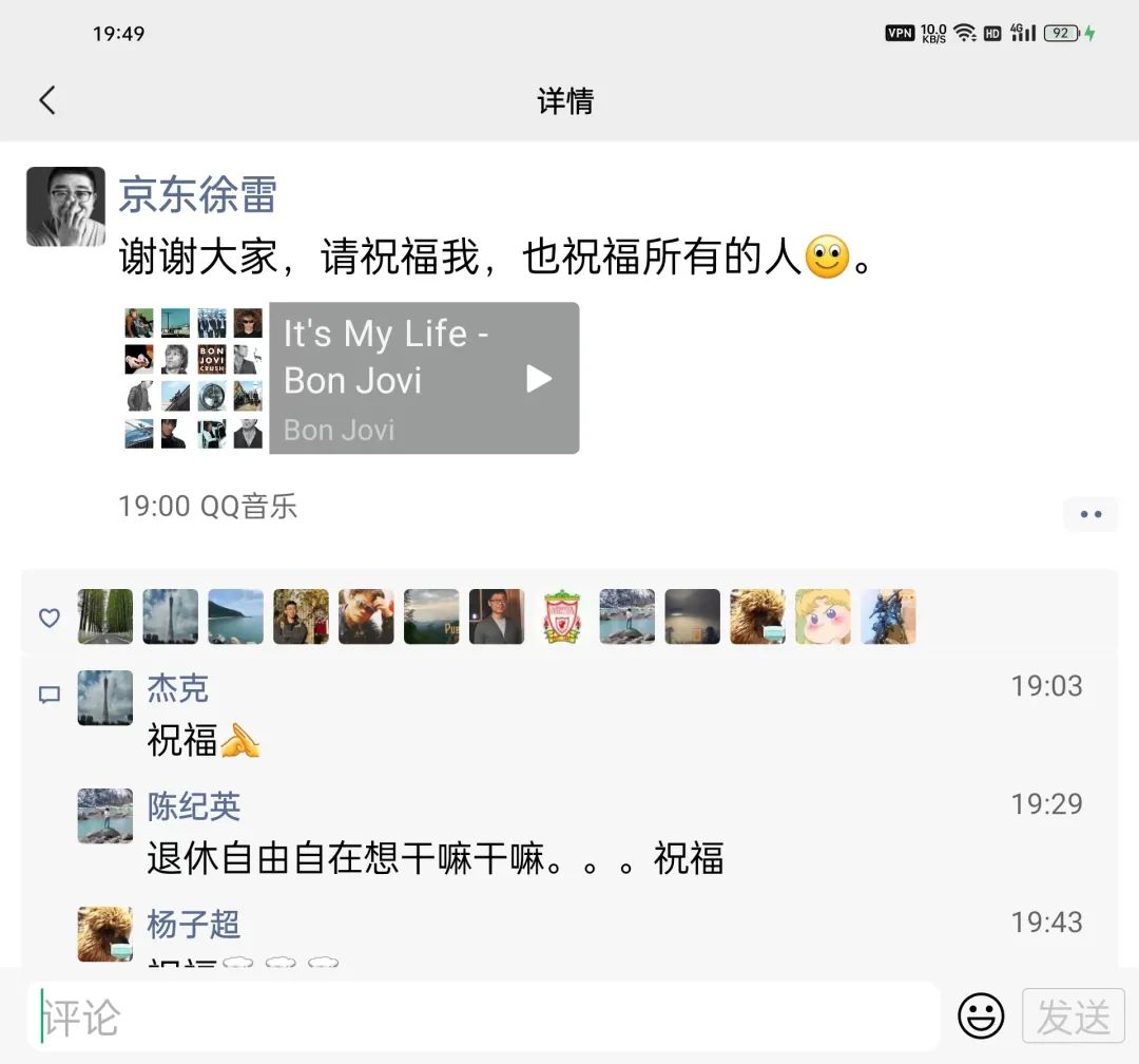 甚至連告別京東的朋友圈,都用上了一首經典的搖滾樂曲《It’s My Life》。