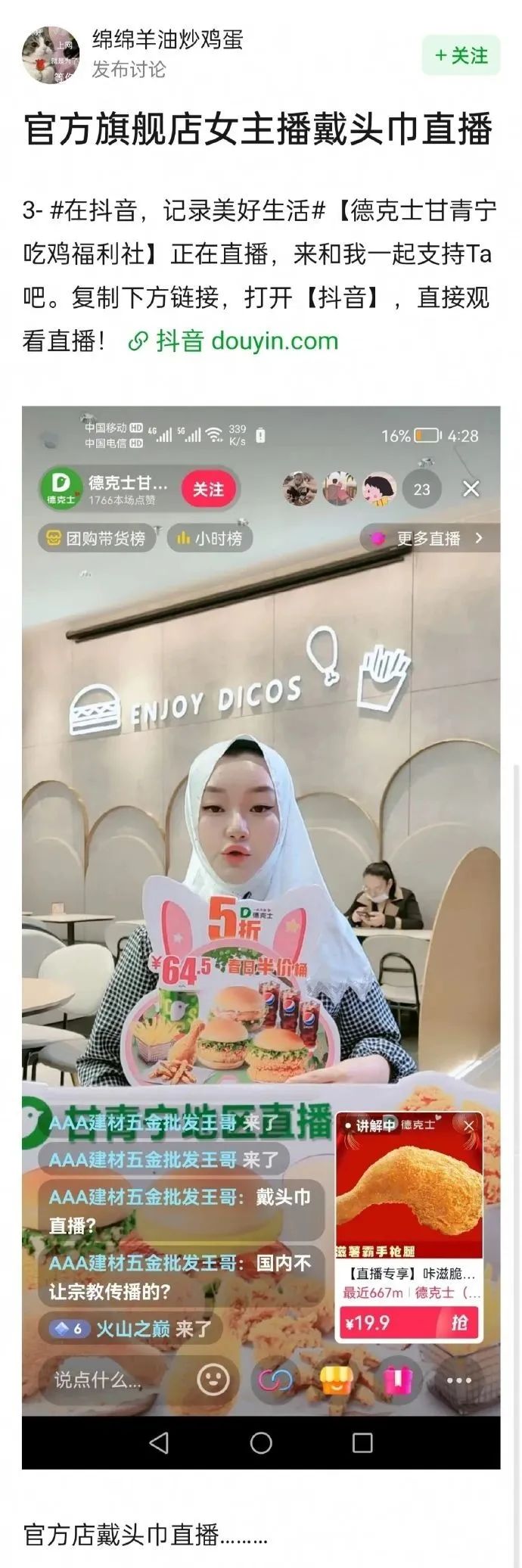 當然,林子大了什麼鳥都有,直播流行之後也難免魚龍混雜,比如有網友反映,某地以連鎖快餐店賬號女主播直播時穿戴極端服飾。我點開圖片一看頓時兩眼一黑——這造型是妥妥的極端宗教服飾裏切克啊!