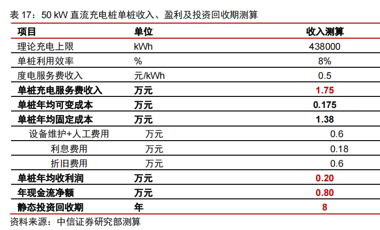 中信證券算過一筆賬,投資一台50千瓦的直流充電樁,初始投資成本約6萬元,如果一天當中的平均利用率只有8%,加上一些其他假設,收回投資大概需要8年,接近一根充電樁報廢的年限。