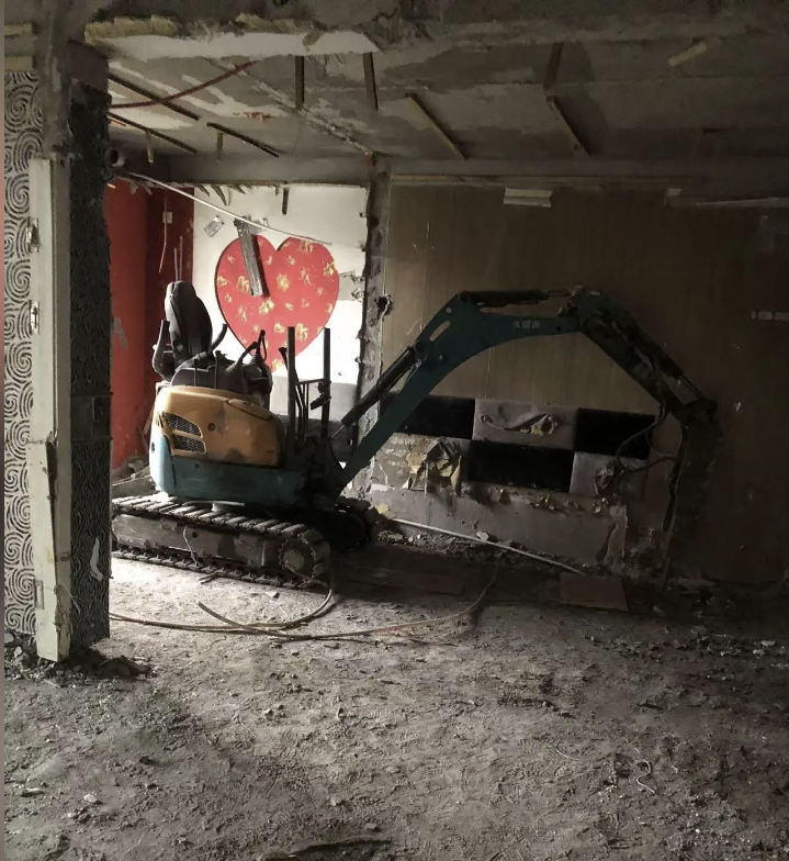 根據網友發佈的視頻顯示,施工方將工程器械開進了室內,並拆毀了多面牆體,其中一面牆體由大量鋼筋支撐。
