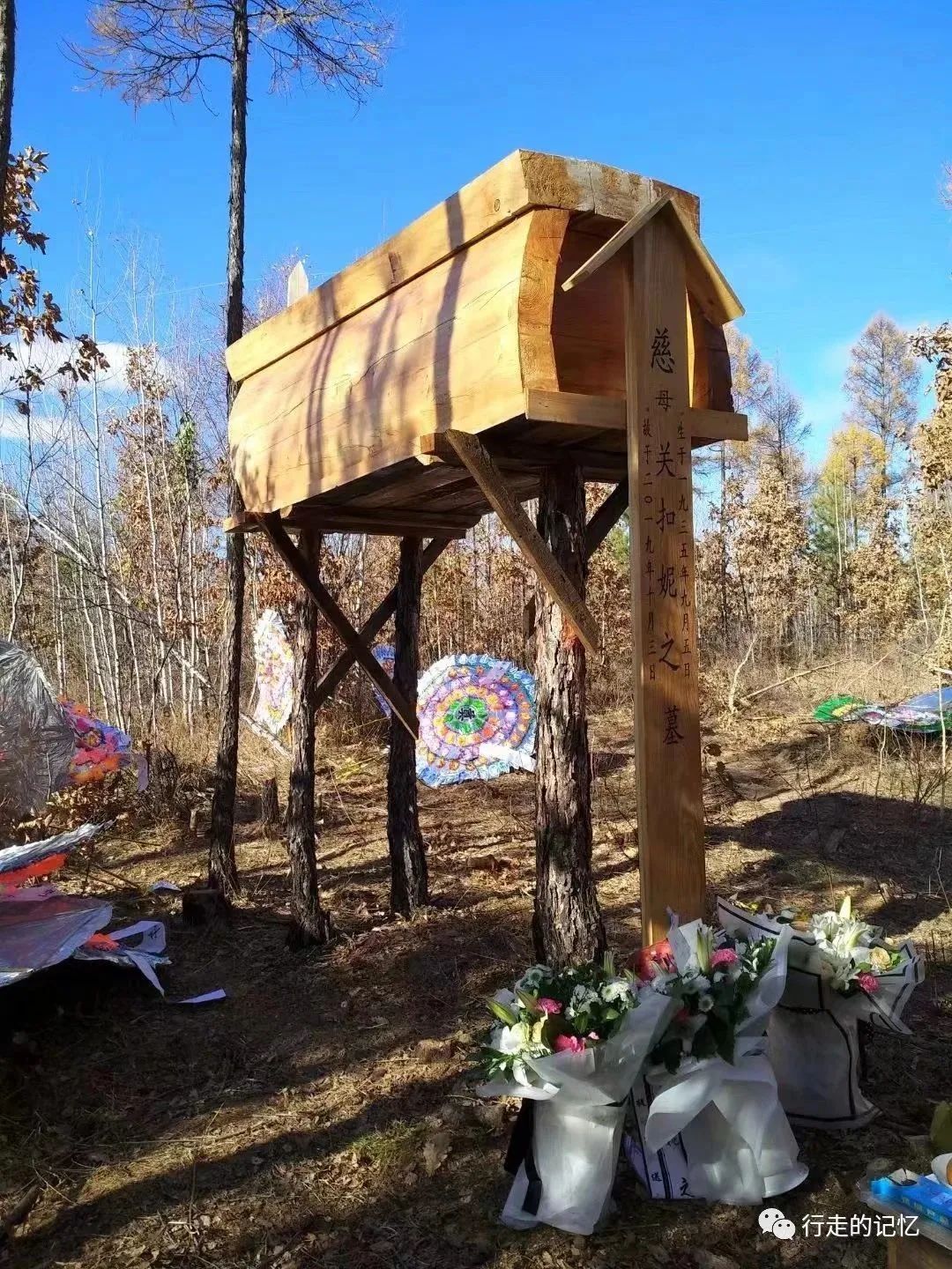 這是關扣尼老薩滿去世後舉行的風葬,三天圓墳,百天脱孝的全過程,按照鄂倫春族喪葬習俗,在她週年三週年時還要舉行週年祭,以此紀念。