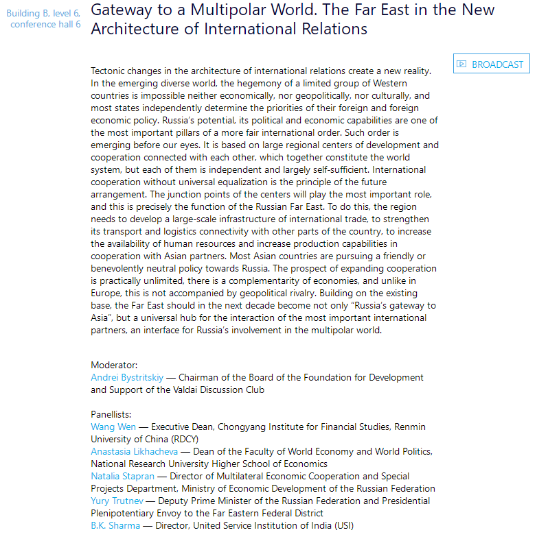 2022年9月6日,在俄羅斯遠東城市符拉迪沃斯託克(海參崴)舉行的第七屆東方經濟論壇第二天,在主題為“通往多極世界的門户:國際關係新架構中的遠東”的分論壇上,俄羅斯副總理兼總統駐遠東聯邦區全權代表尤里·特魯特涅夫(Yury Trutnev)、俄羅斯經濟發展部多邊經濟合作司司長納塔裏婭·斯塔皮拉(Natalia Stapran)、俄羅斯國立研究大學世界經濟與政治學院院長阿娜斯塔西婭(Anastasia Likhacheva)、印度聯合服務機構主席莎瑪(B.K. Sharma)和中國人民大學重陽金融研究院執行院長王文同組討論,並接受參會媒體的集體採訪。以下為王文多輪發言內容及視頻集錦: