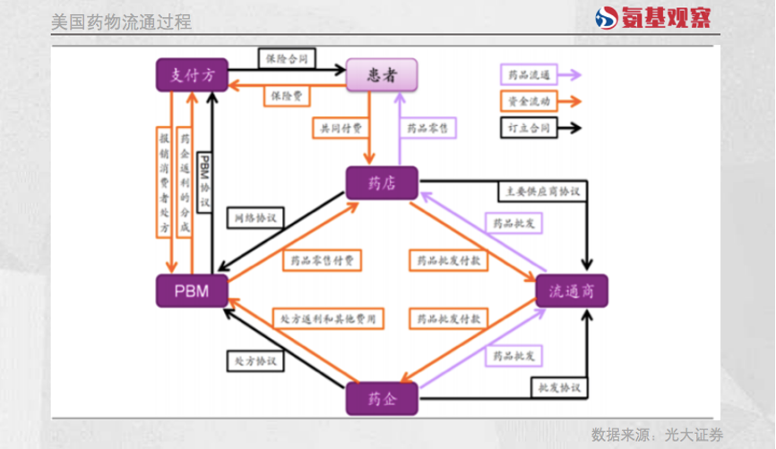 為什麼美國藥價高昂?最核心的因素之一,是在自由定價法下形成了“製藥商+批發商+PBMs”的聯合陣營,它們壟斷着藥物流通,左右着藥物價格。